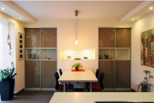 durch zwei symmetrische Gleittürenschränke zu schaffen, was komplett von der Firma Krings geplant und ausgeführt wurde.